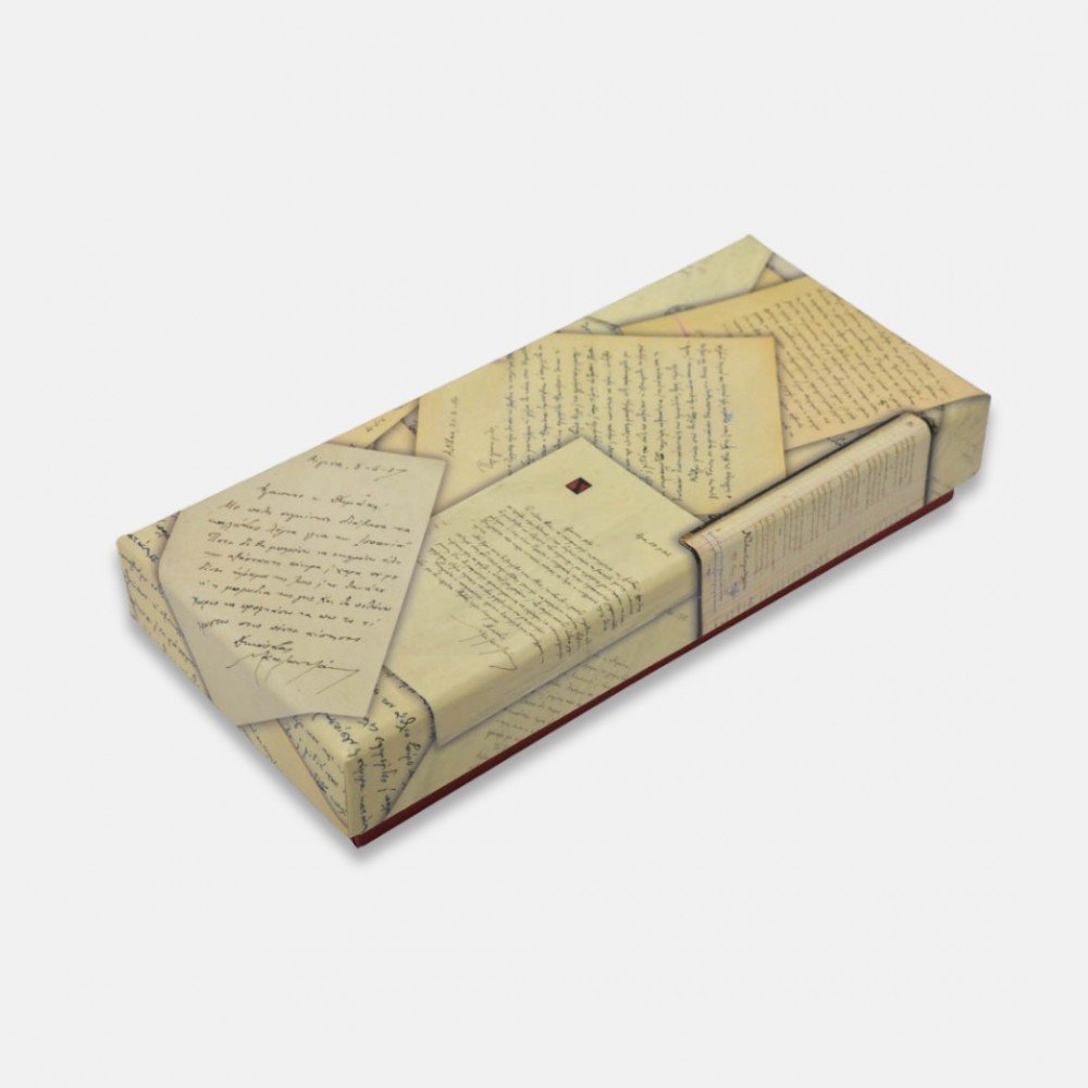 Χαρτόδετη κασετίνα με εικαστικό εμπνευσμένο από τα χειρόγραφα του Νίκου Καζαντζάκη.