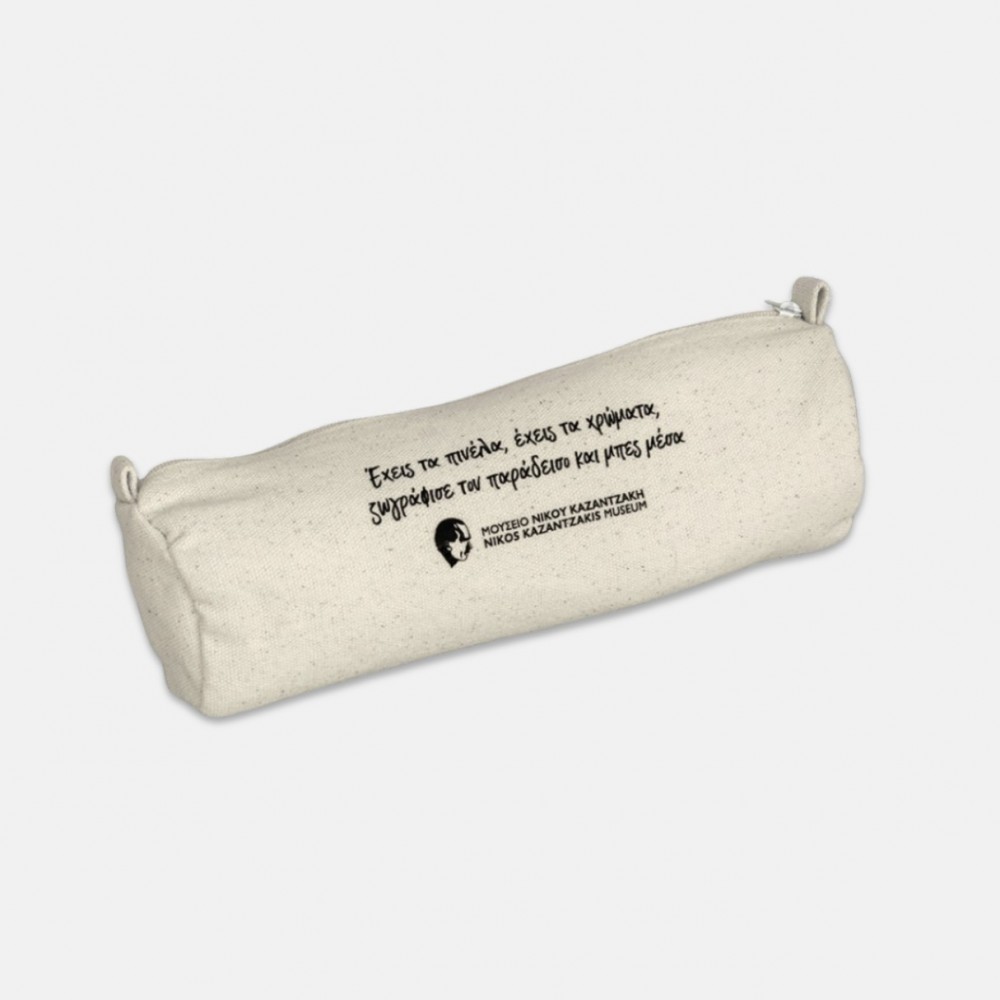 Κασετίνα βαρελάκι με φερμουάρ και χαρακτηριστική φράση από το έργο του Νίκου Καζαντζάκη..