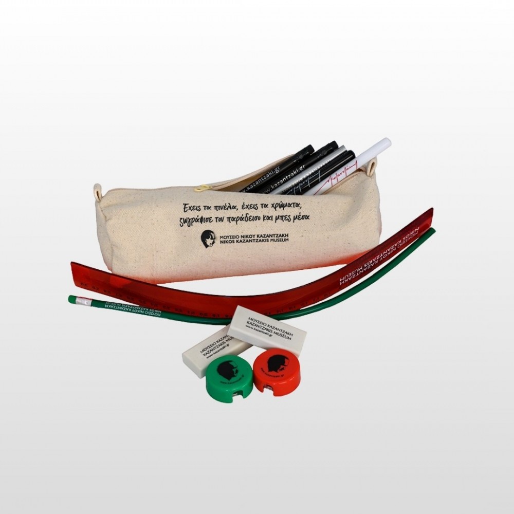 Κασετίνα βαρελάκι με φερμουάρ και χαρακτηριστική φράση από το έργο του Νίκου Καζαντζάκη..