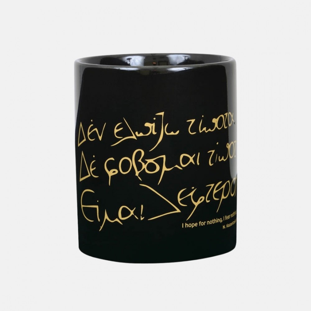 Κεραμική κούπα με το ταφικό επίγραμμα «Δεν ελπίζω τίποτα, δε φοβούμαι τίποτα, είμαι λέφτερος» που χαράχτηκε στον τάφο του Νίκου Καζαντζάκη