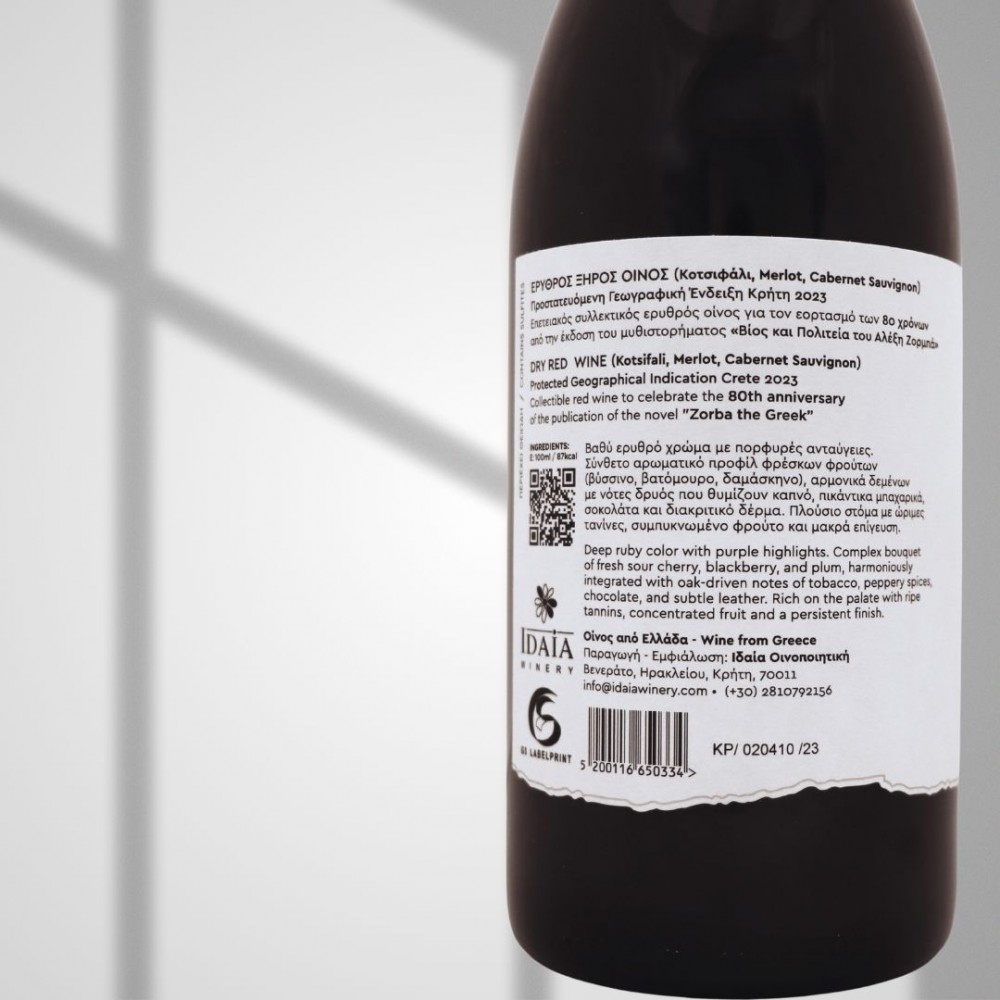 μυθιστορήματος «Βίος και πολιτεία του Αλέξη Ζορμπά». Η ετικέτα κάθε φιάλης