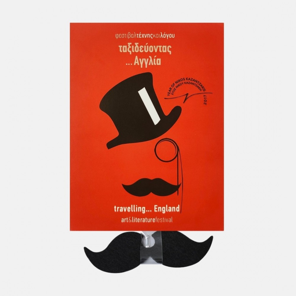 Αναμνηστικό καρτ ποστάλ από το ετήσιο φεστιβάλ Τέχνης και Λόγου "Ταξιδεύοντας, Αγγλία" . Περιλαμβάνει αποσπώμενο μουστάκι.